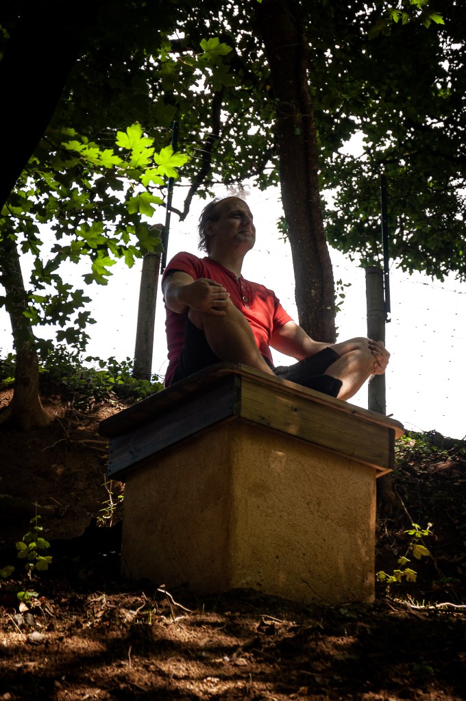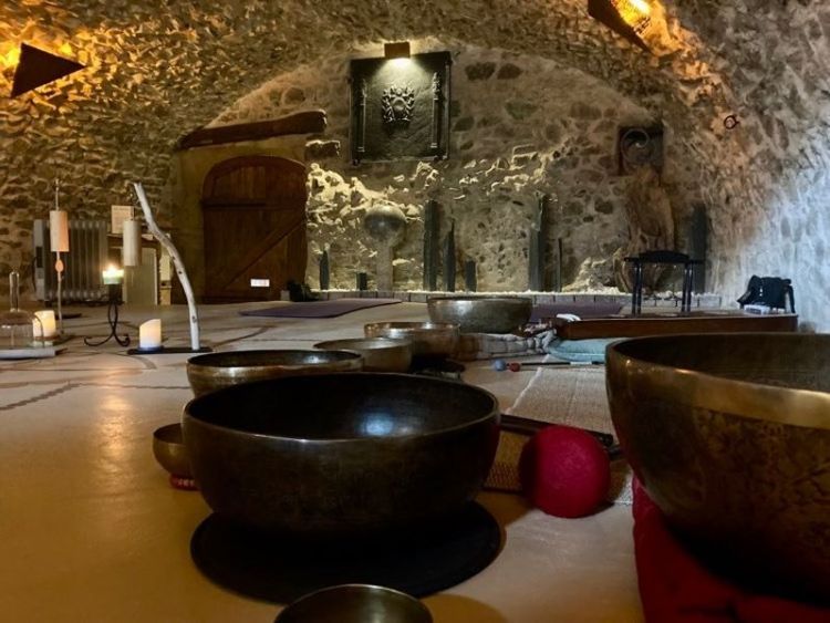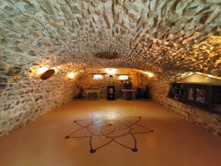 Une salle voûtée en pierres apparentes (35m²), aménagée et équipée pour la méditation.